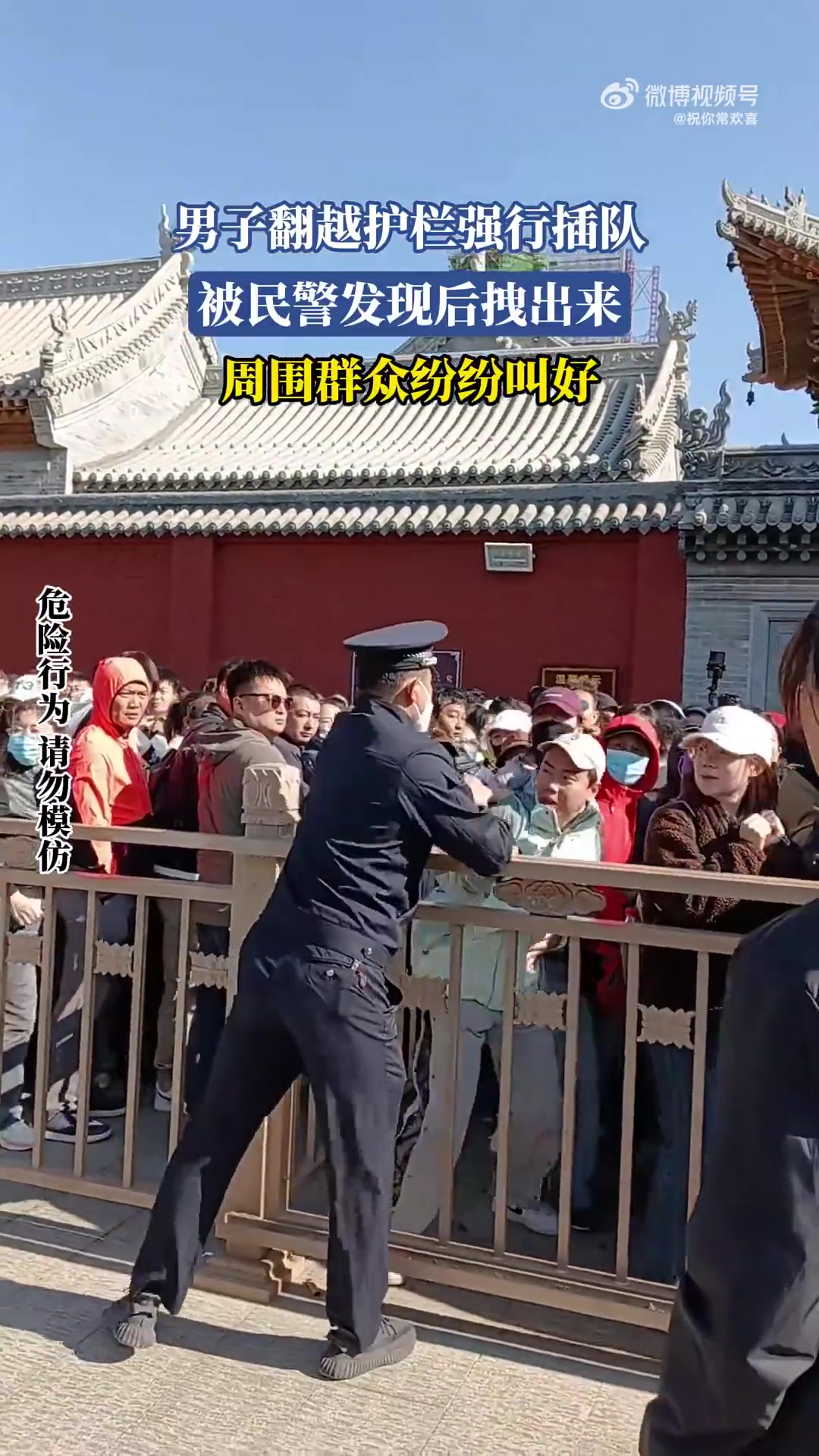 >男子翻越护栏强行插队,被民警发现后拽出来,周围群众纷纷叫好!