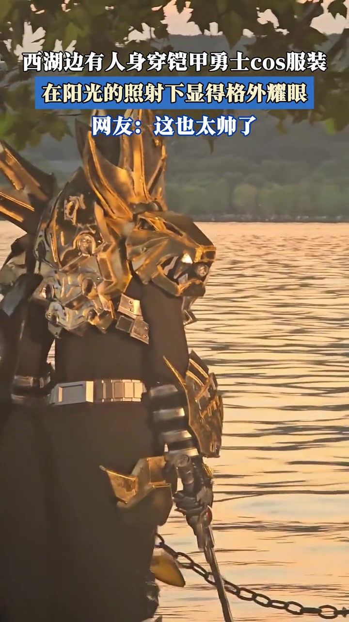 西湖边有人身穿铠甲勇士cos服装,在阳光的照射下显得格外耀眼!