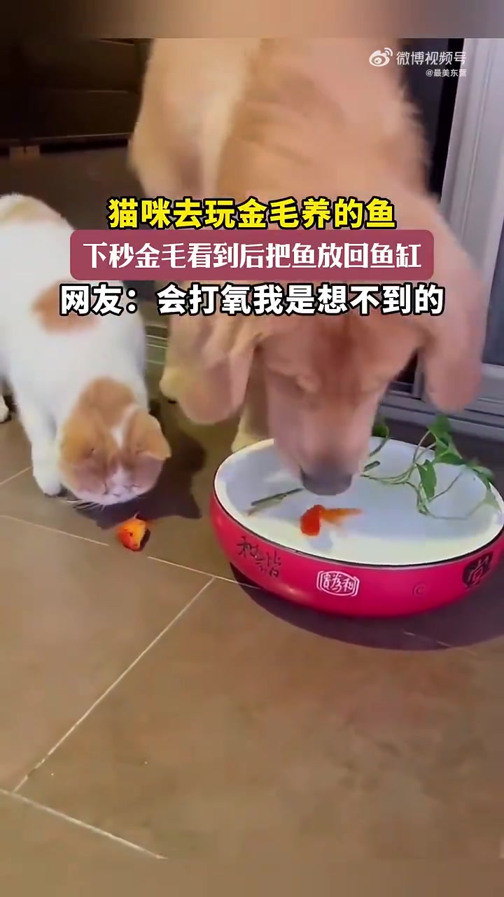 >猫咪逗鱼遭金毛 “抢救”,网友:金毛还会打氧?