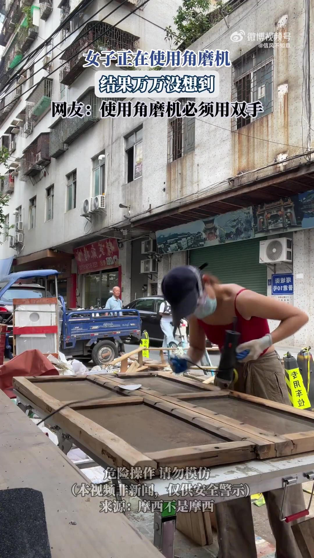 >女子正在使用角磨机,结果万万没想到,使用角磨机必须用双手!