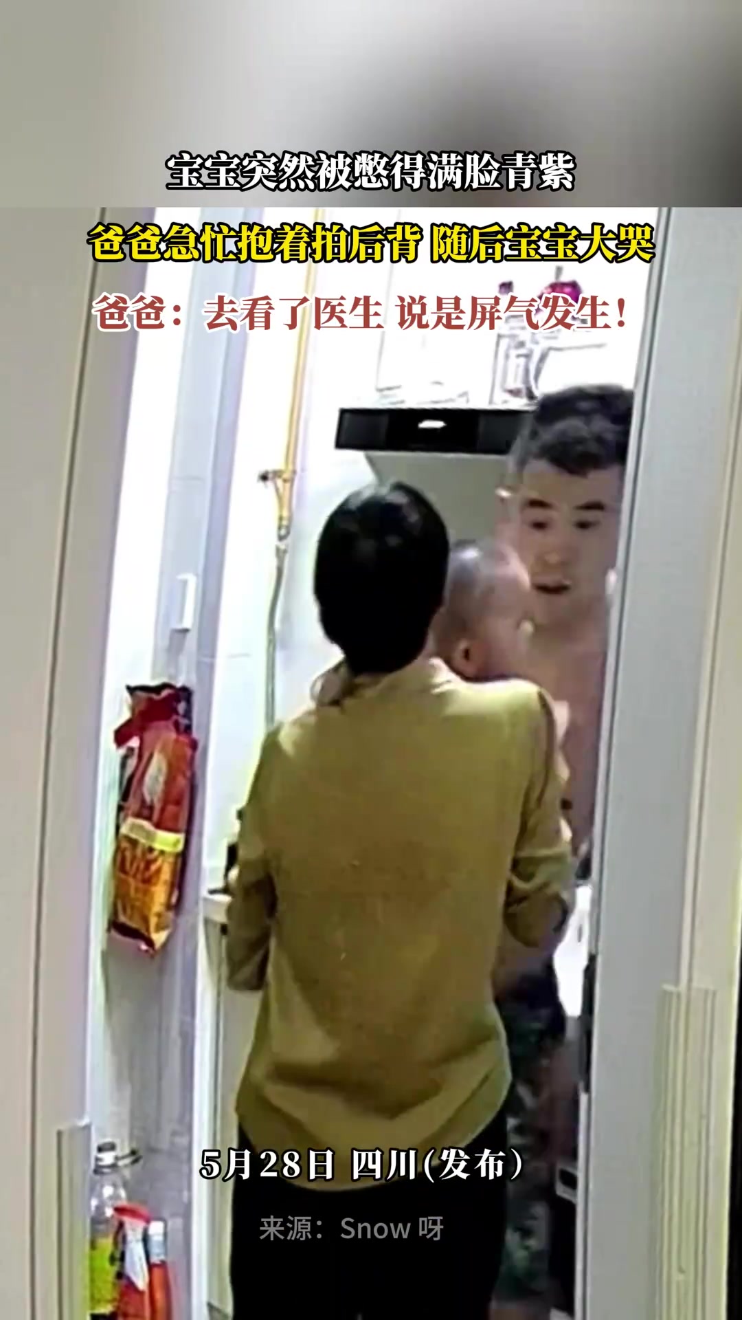 宝宝突然被憋得满脸青紫,爸爸急忙抱着拍后背 随后宝宝大哭