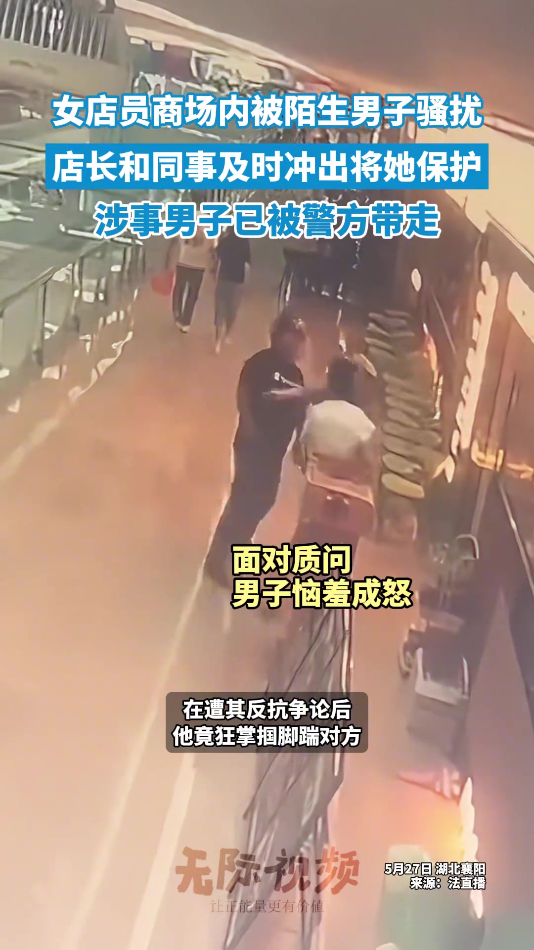 >女店员商场内被陌生男子骚扰,店长和同事及时冲出将她保护!!