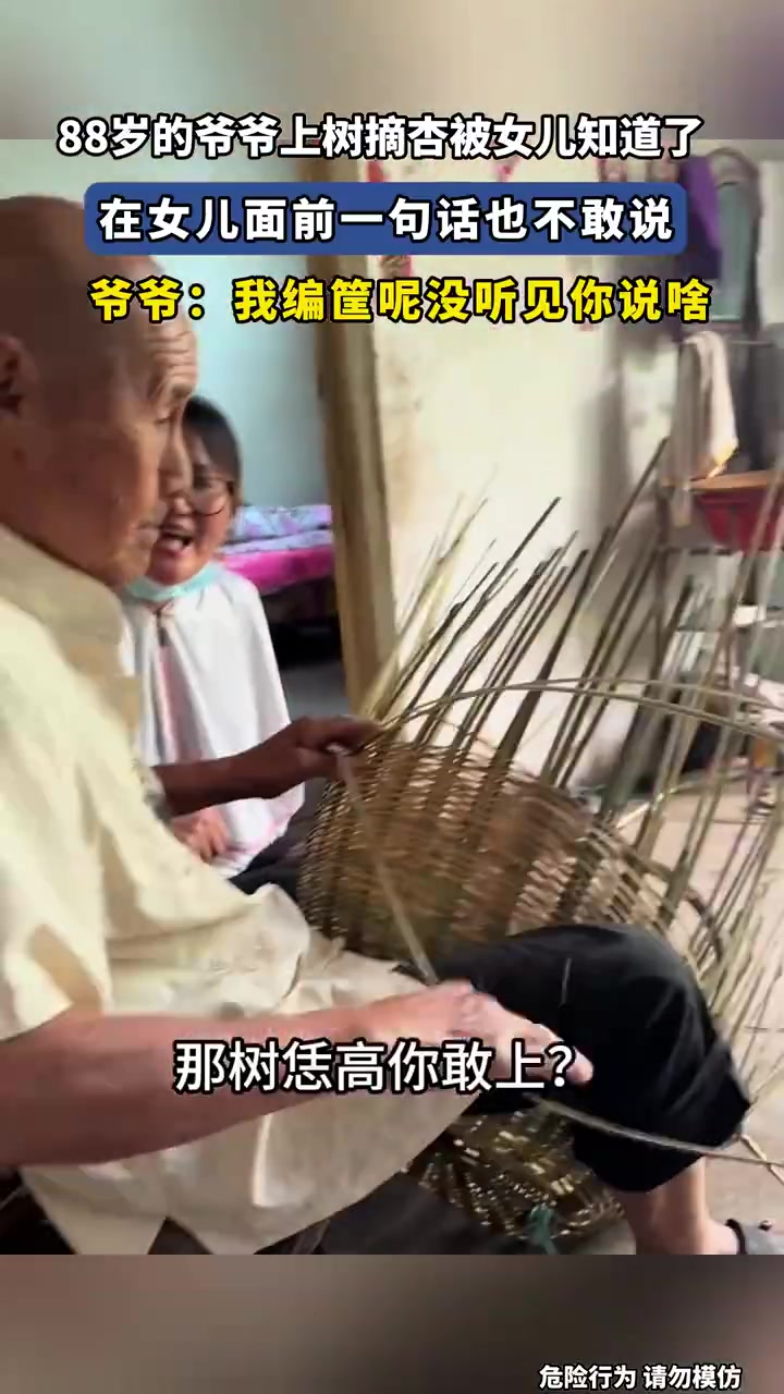 >88岁的爷爷上树摘杏被女儿知道了 在女儿面前一句话也不敢说