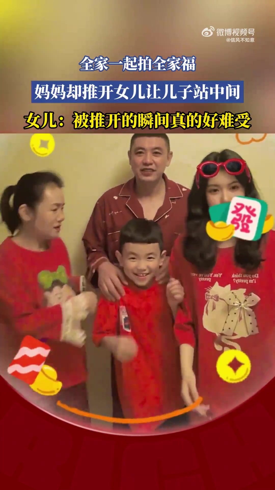 >拍全家福时妈妈推开女儿,让儿子站中间