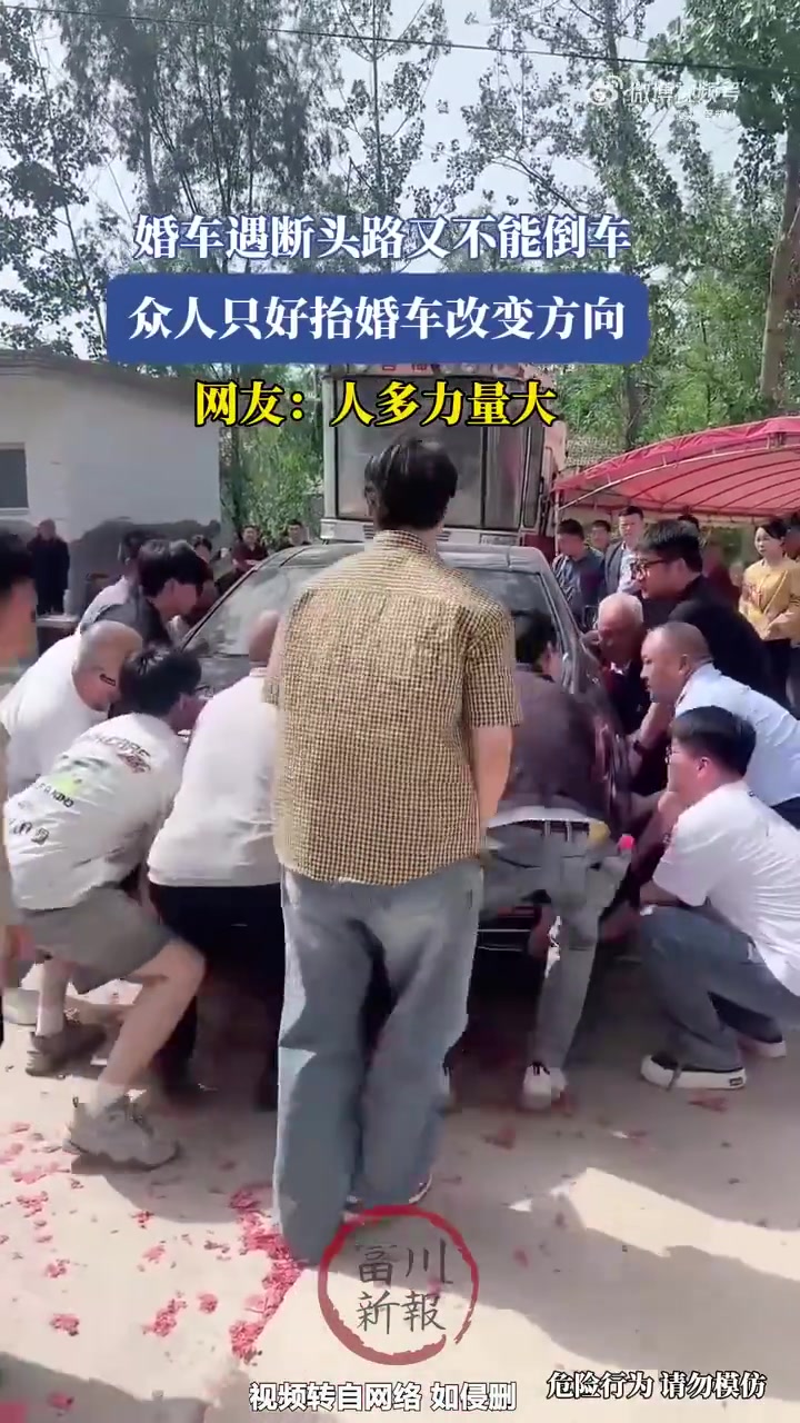 >婚车遇断头路无法倒车,众人合力抬车转向