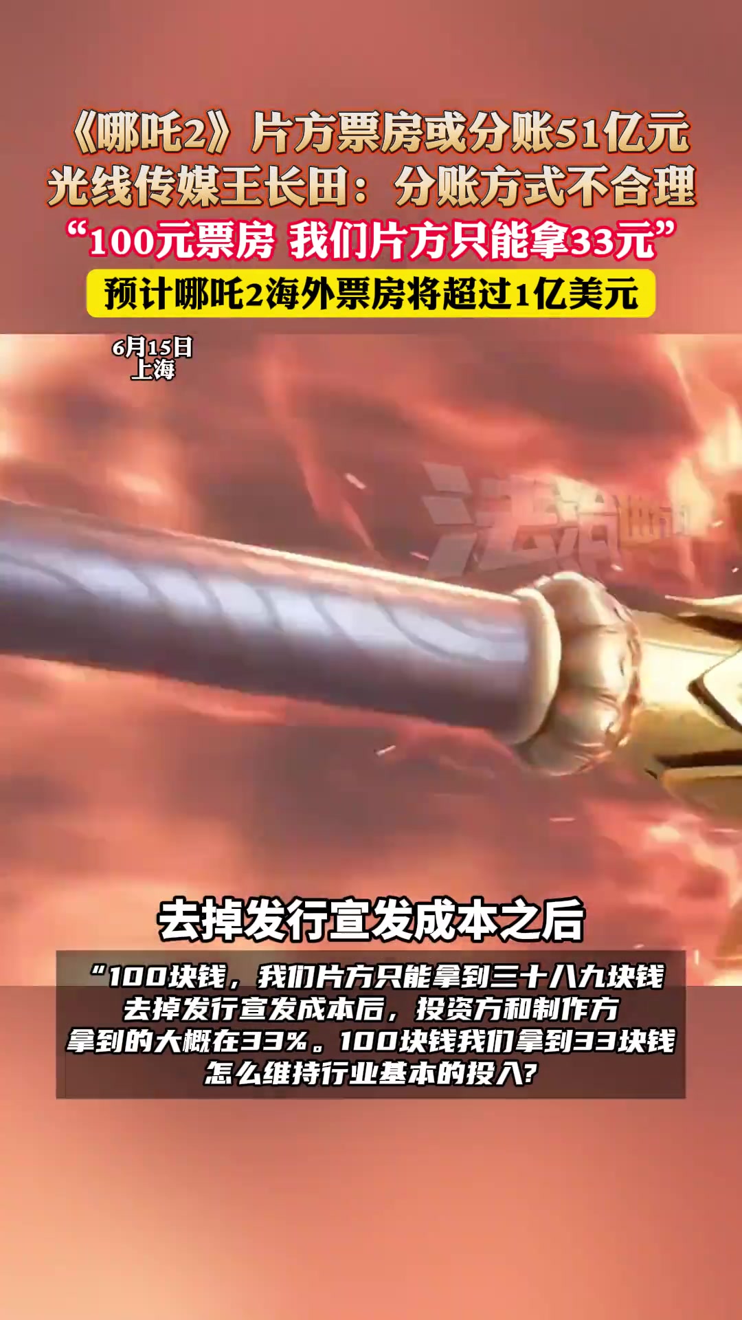哪吒2片方票房或分账51亿元,光线传媒王长田:分账方式不合理