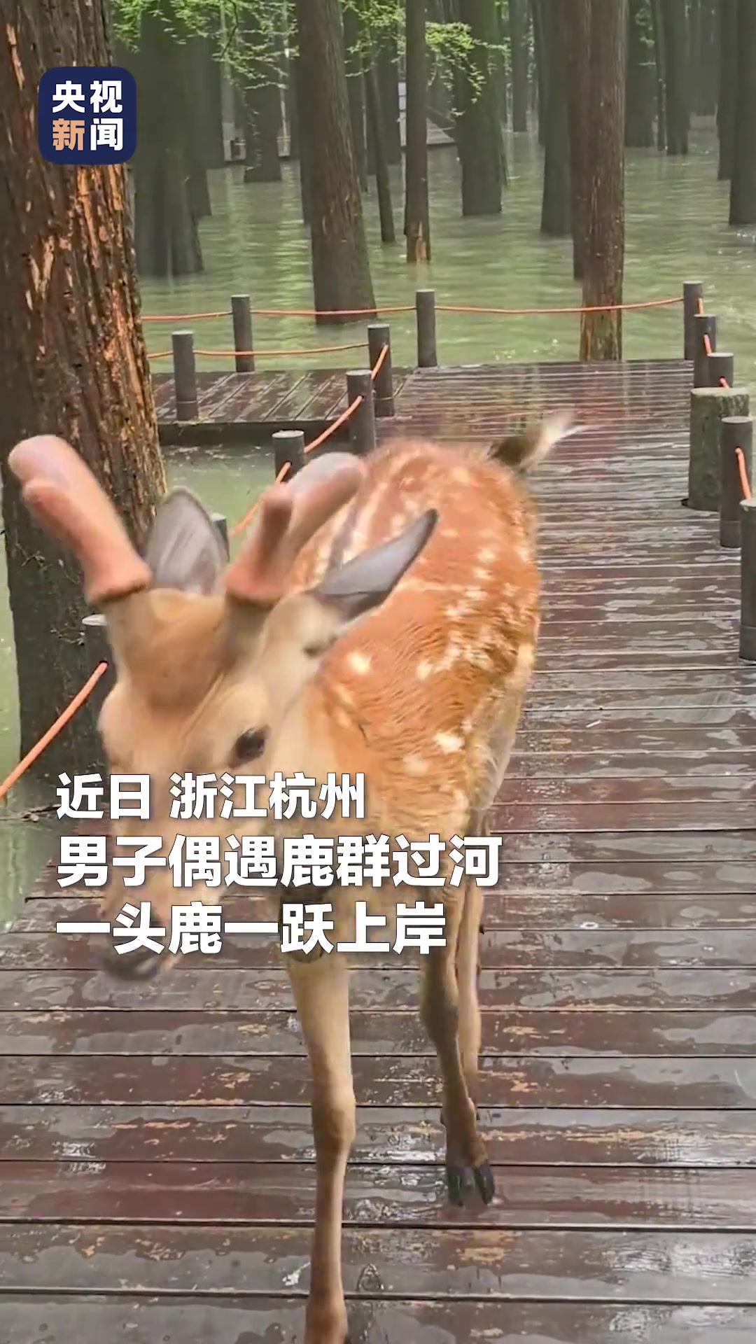 绝美瞬间!男子在水上森林偶遇鹿群,一头鹿轻盈跃出水面。