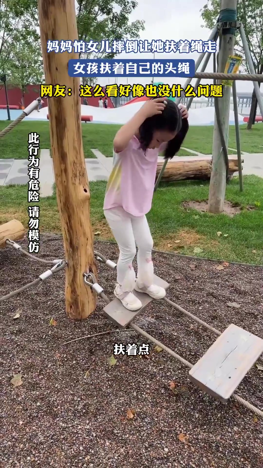 妈妈怕女儿摔倒让她扶着绳走,女孩扶上了自己的头绳!