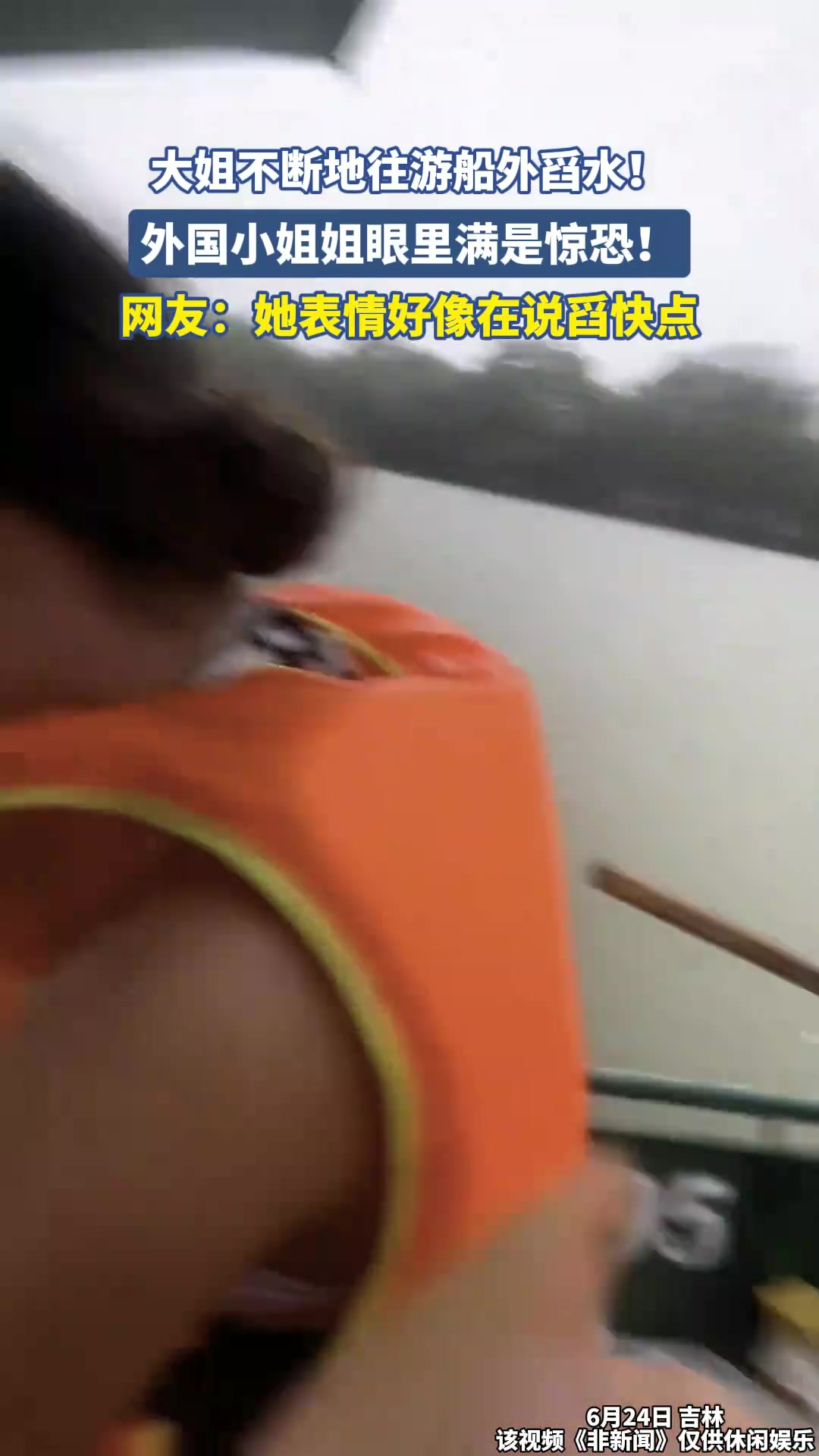 >大姐不断地往游船外舀水!外国小姐姐眼里满是惊恐!