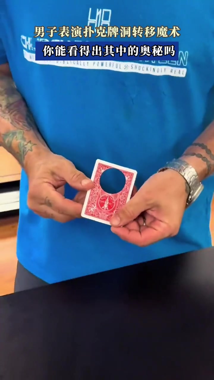 >男子表演扑克牌洞转移魔术,你能看得出其中的奥秘吗