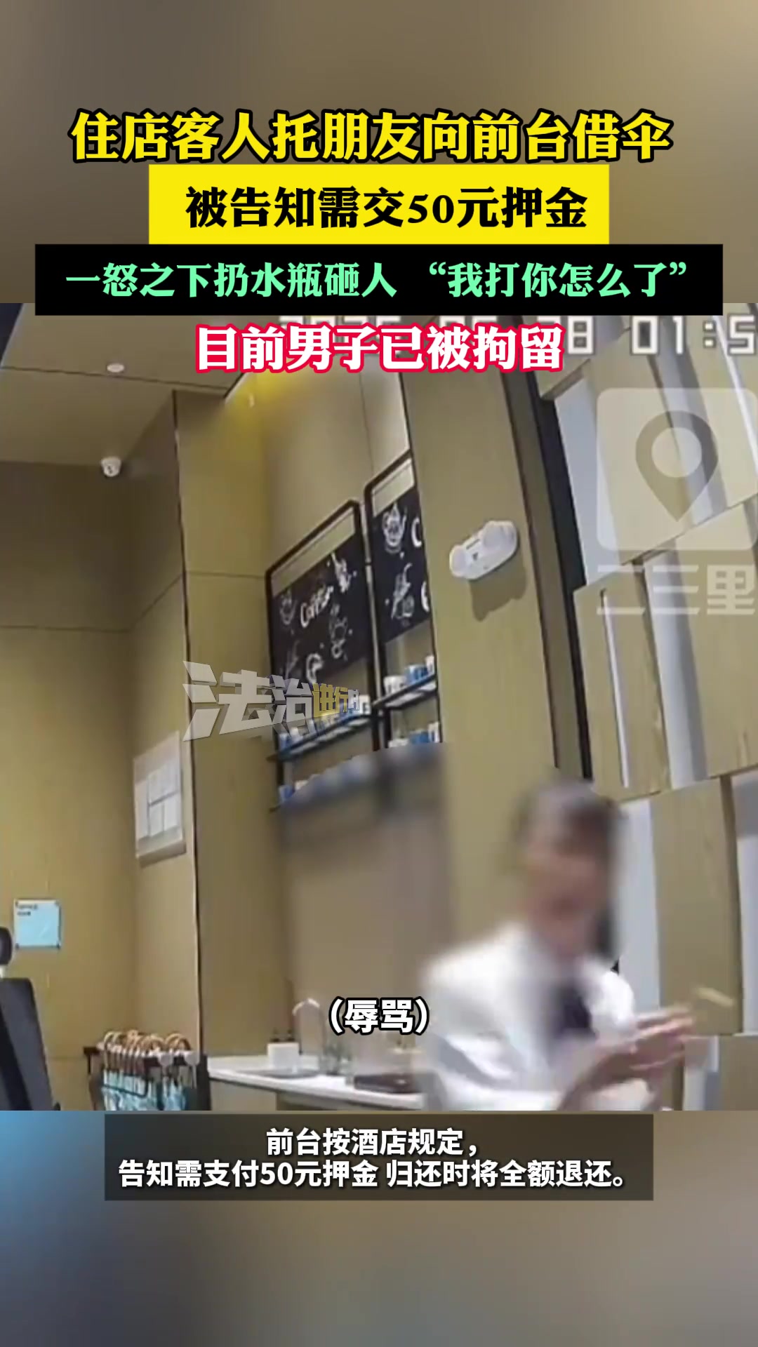>客人向前台借伞需交50元押金, 男子一怒之下扔水瓶砸人