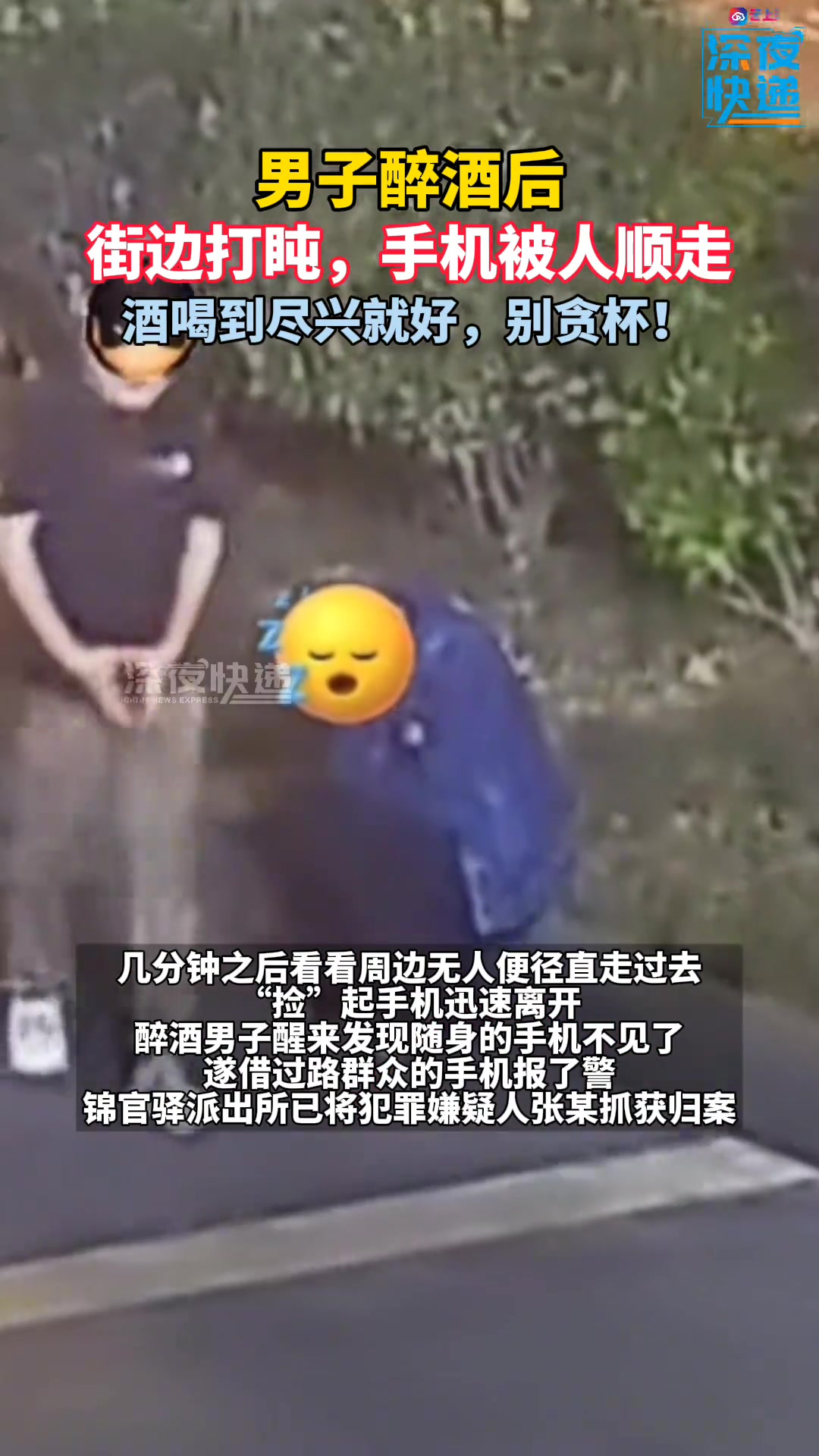 凌晨的街头一名醉酒男子坐在花台边打盹,手机被路人顺走。