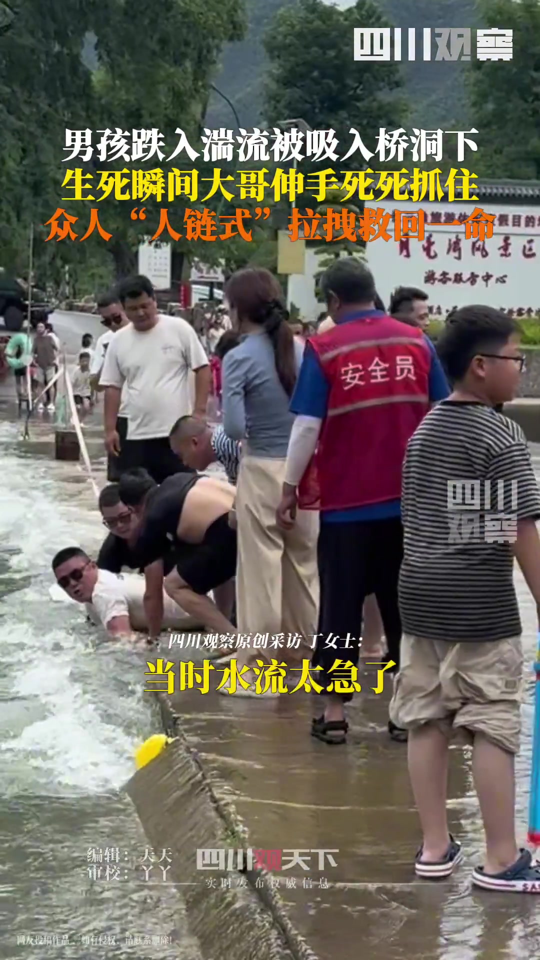 男孩跌入湍流被吸入桥洞下,众人激流中合力拽回坠河男孩
