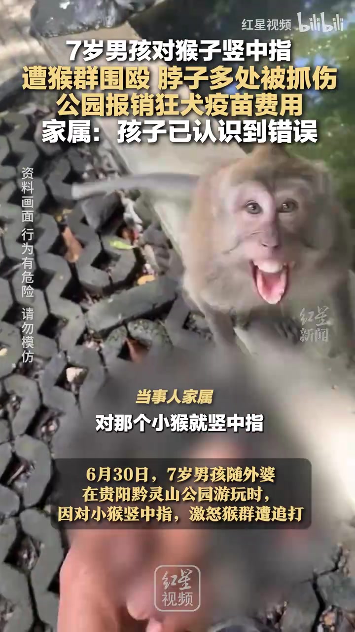 7岁男孩对猴子竖中指 遭猴群围殴 脖子多处被抓伤
