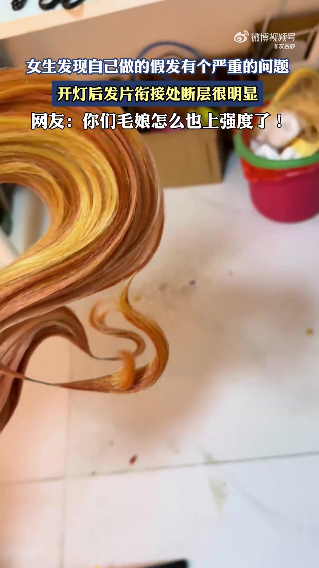 >女生发现自己做的假发有个严重的问题,开灯后发片衔接断层很明显