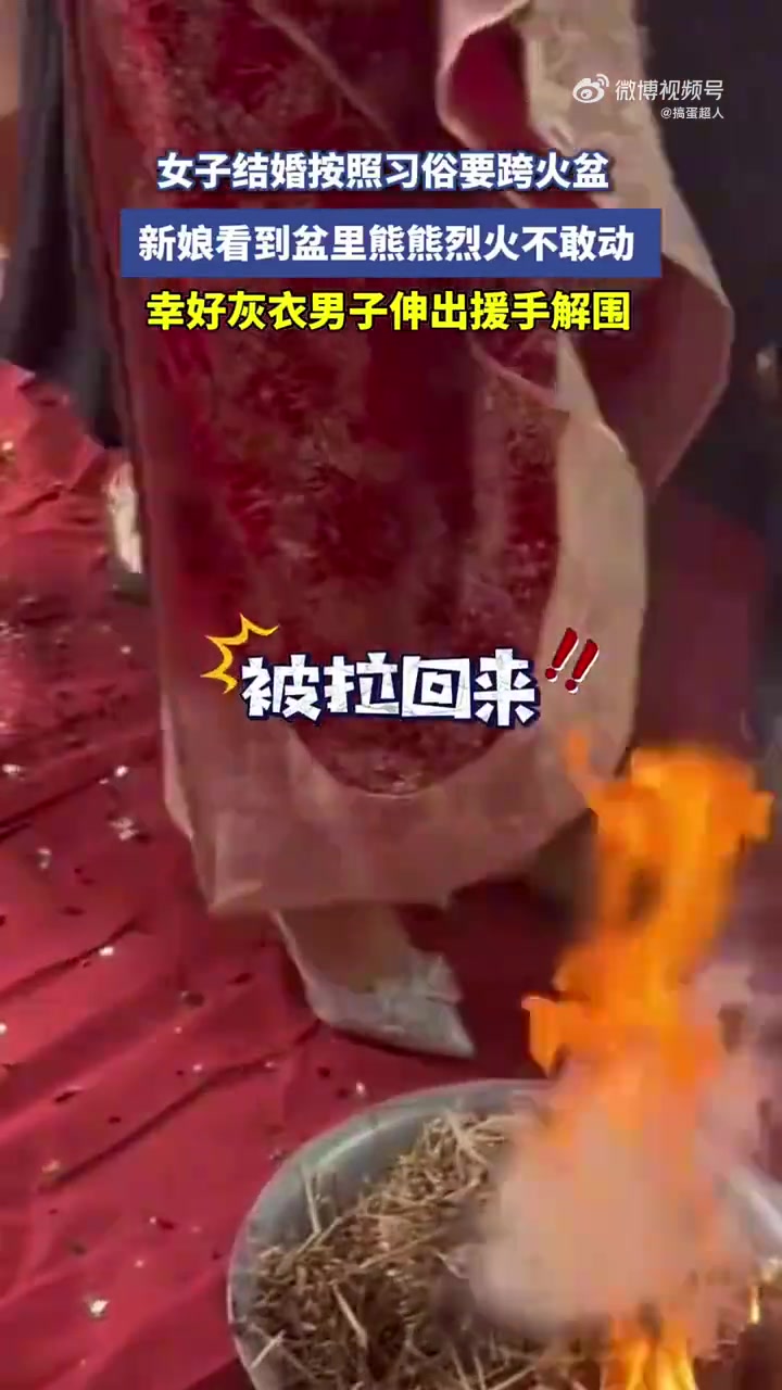 >女子依习俗结婚需跨火盆,面对烈火新娘不敢迈步