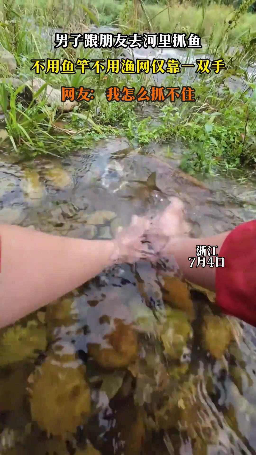 男子跟朋友去河里抓鱼,不用鱼竿不用渔网仅靠一双手!