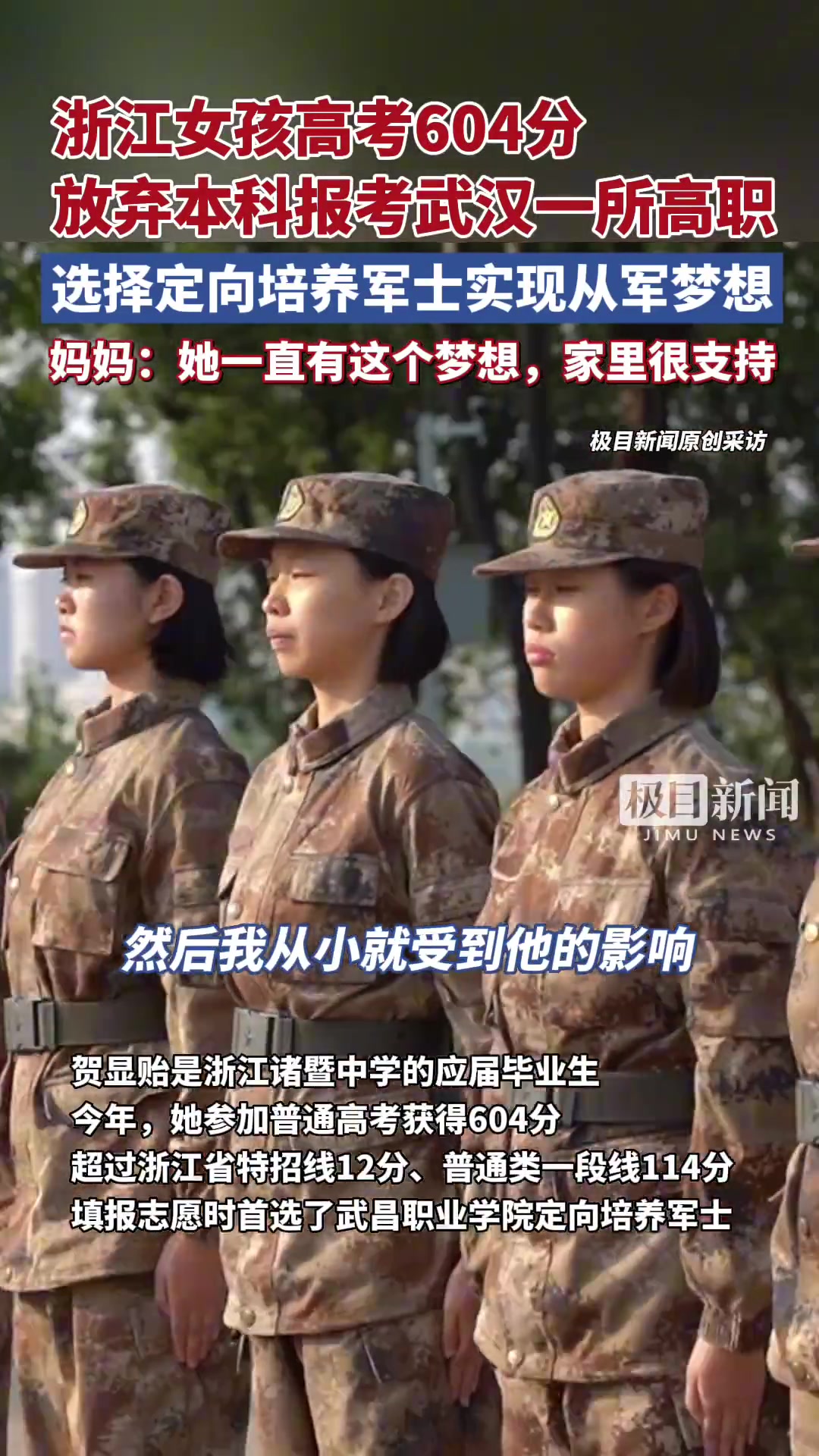 >立志从军!高考604分女生被一所高职录取