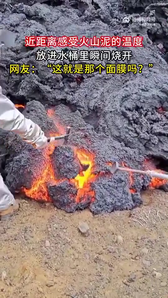 >近距离体验火山泥温度,放入水桶瞬间沸腾