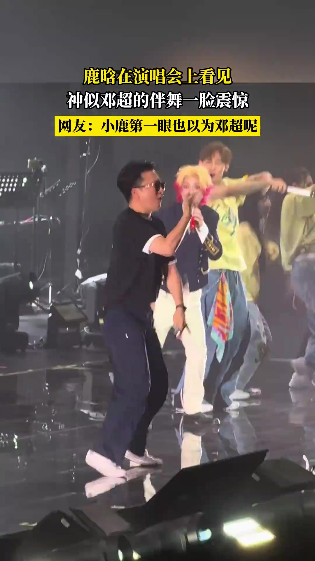 >在璀璨的舞台灯光下,鹿晗的目光被一位伴舞深深吸引