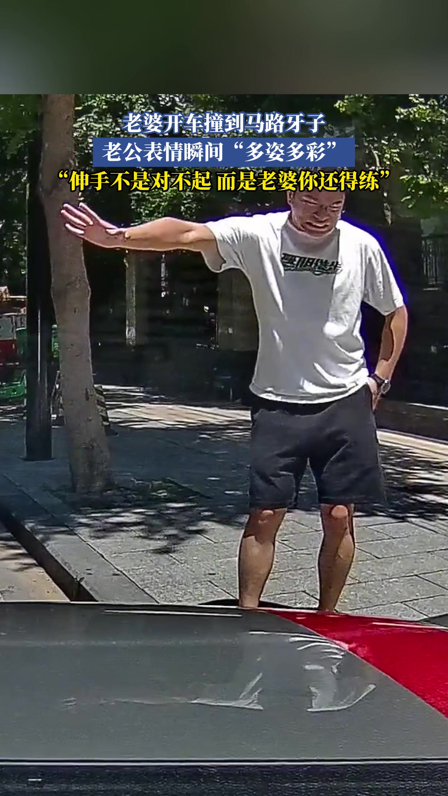 >老婆开车撞到马路牙子,老公表情瞬间“多姿多彩”!