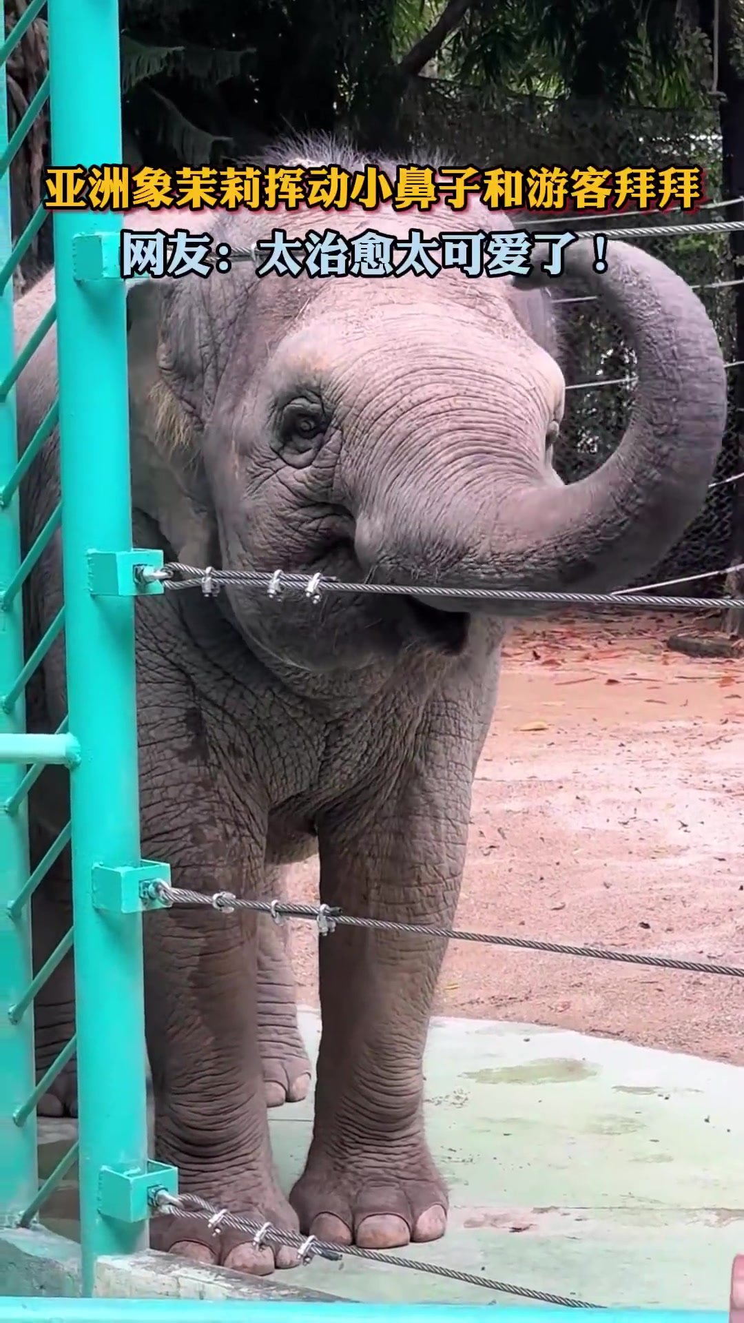 亚洲象茉莉挥动小鼻子和游客拜拜