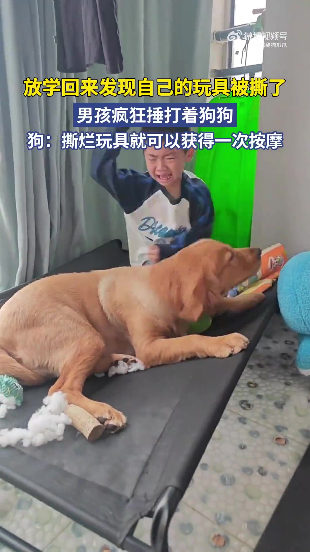 放学回来发现自己的玩具被撕了,男孩疯狂捶打着狗狗!