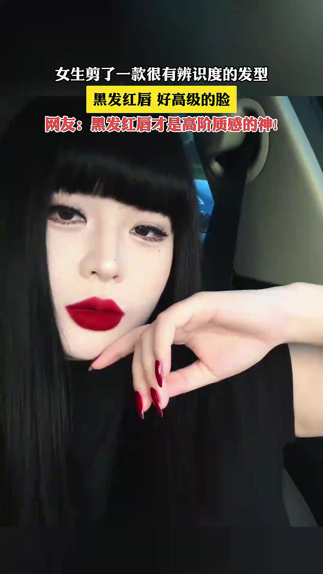 女生剪了一款很有辨识度的发型,黑发红唇,好高级的脸!