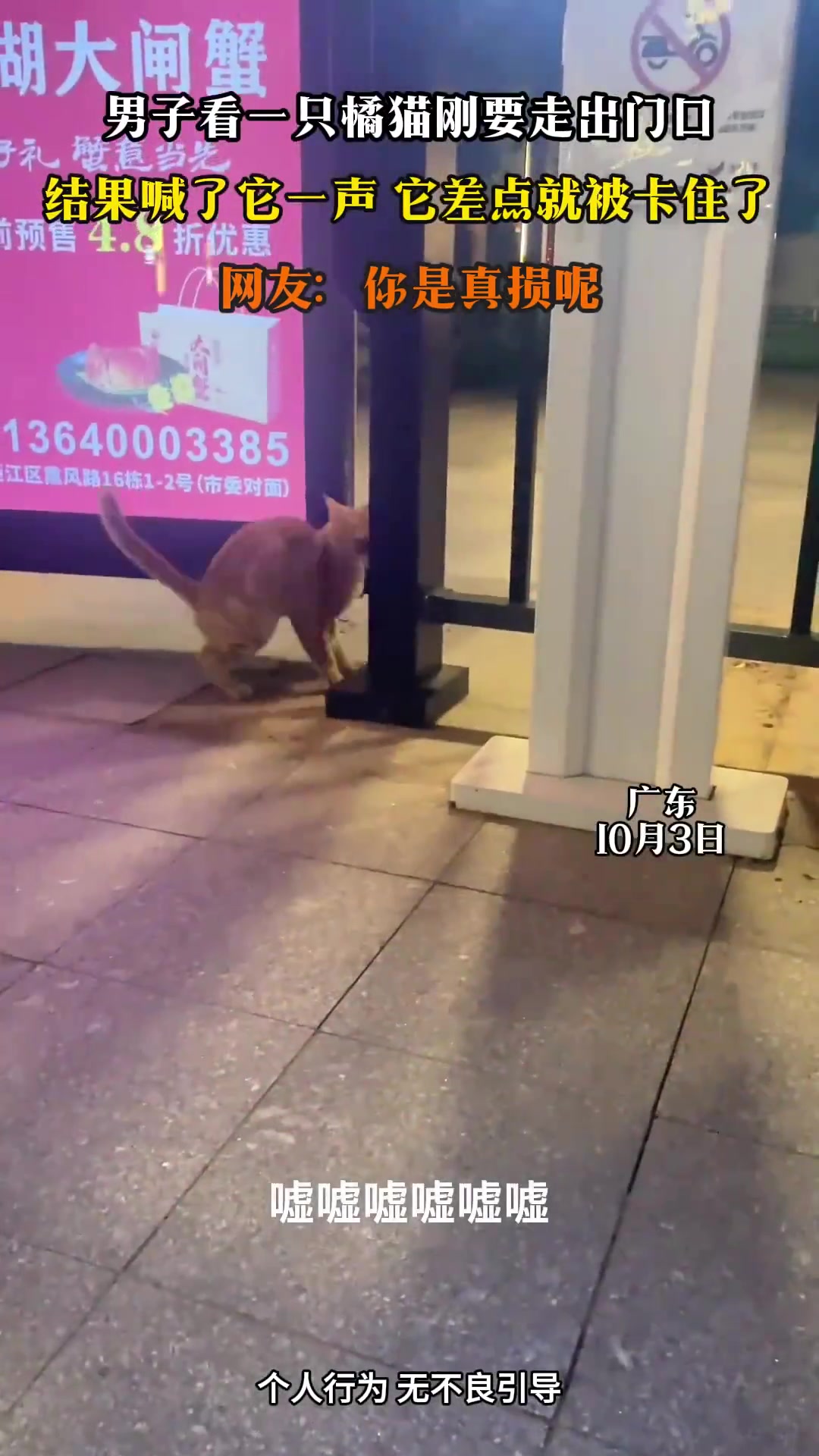 男子看一只橘猫刚要走出门口,结果喊了它一声,它差点就被卡住了