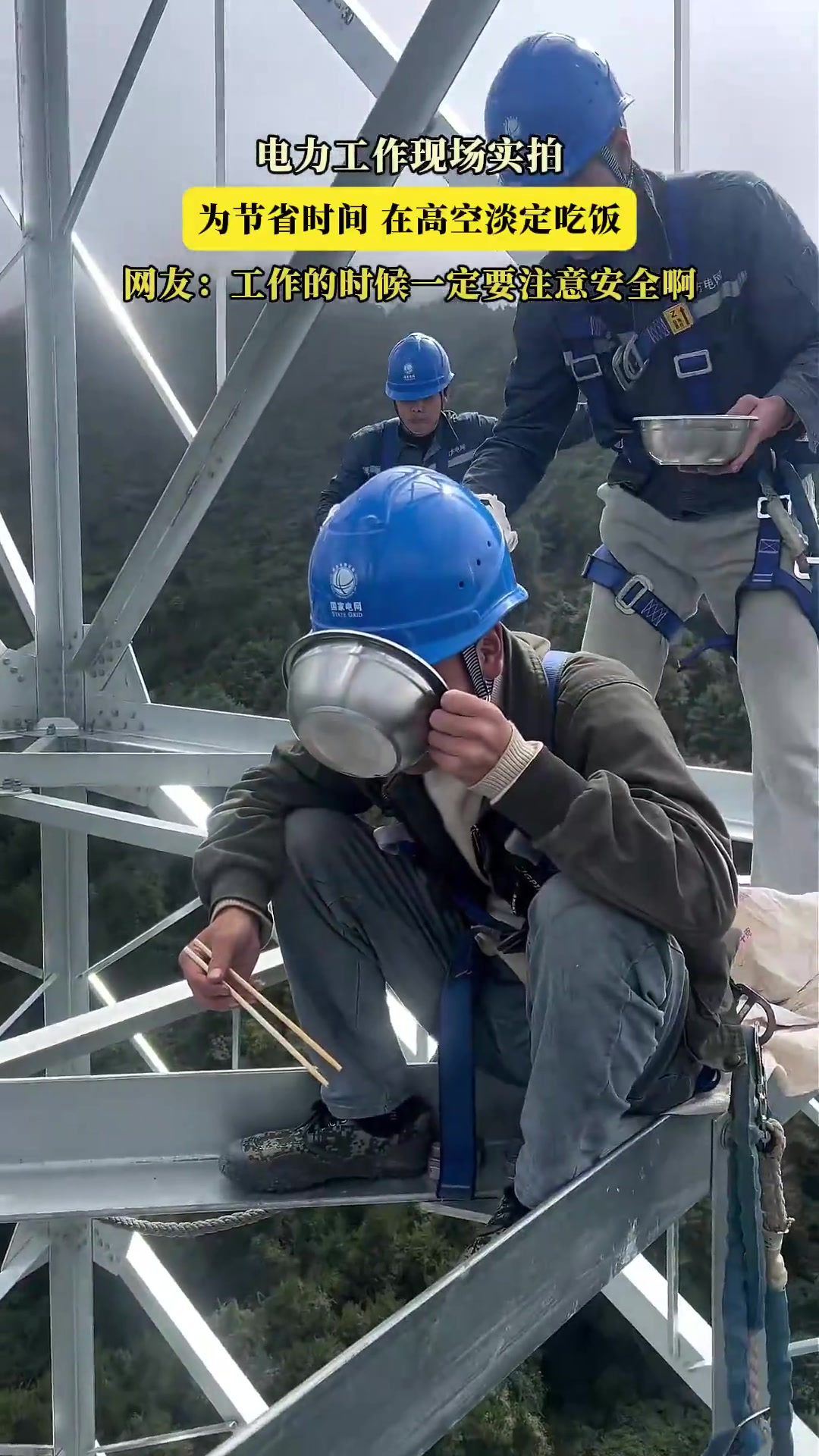 电力工作现场实拍,为节省时间,在高空淡定吃饭