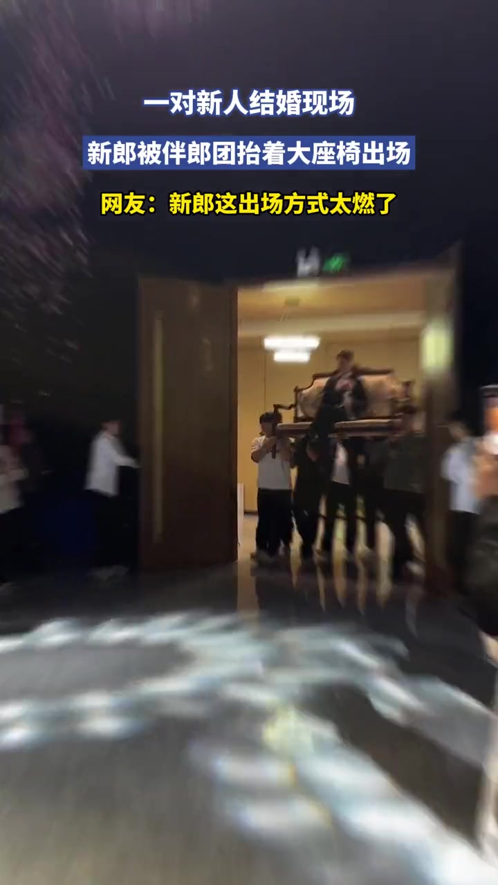 一对新人结婚现场,新郎被伴郎团抬着大座椅出场,太燃了
