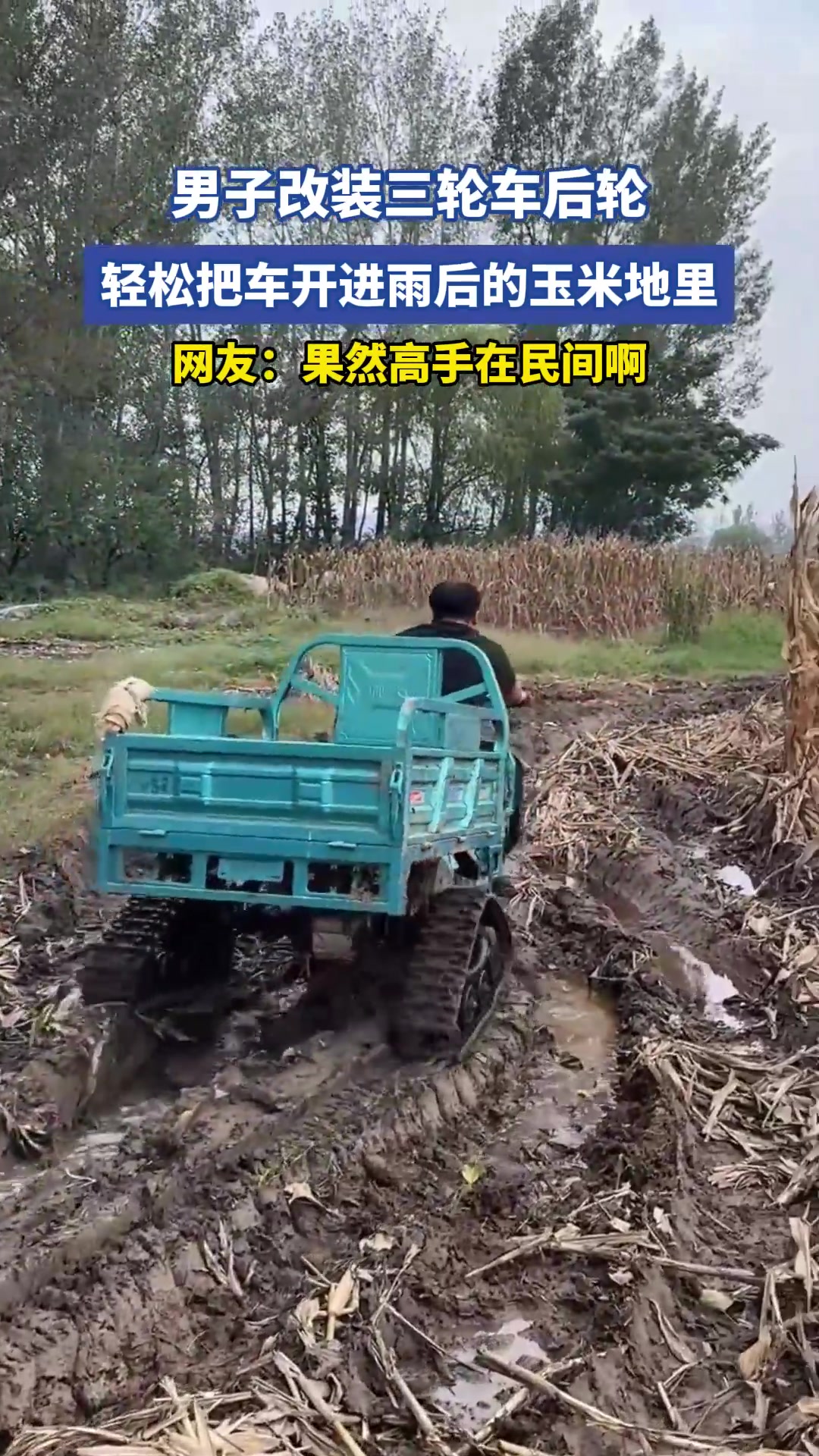 >男子改装三轮车后轮,轻松把车开进雨后的玉米地里