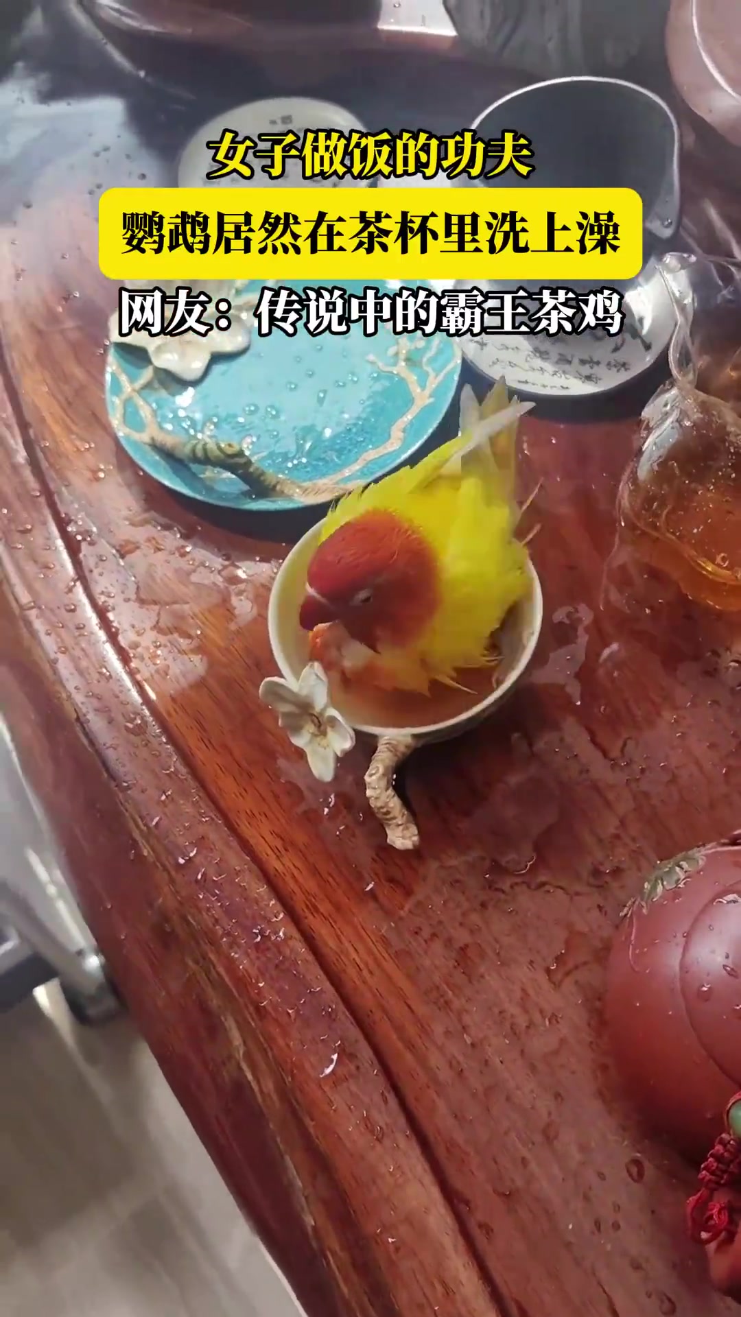 >女子做饭的功夫,鹦鹉居然在茶杯里洗上澡