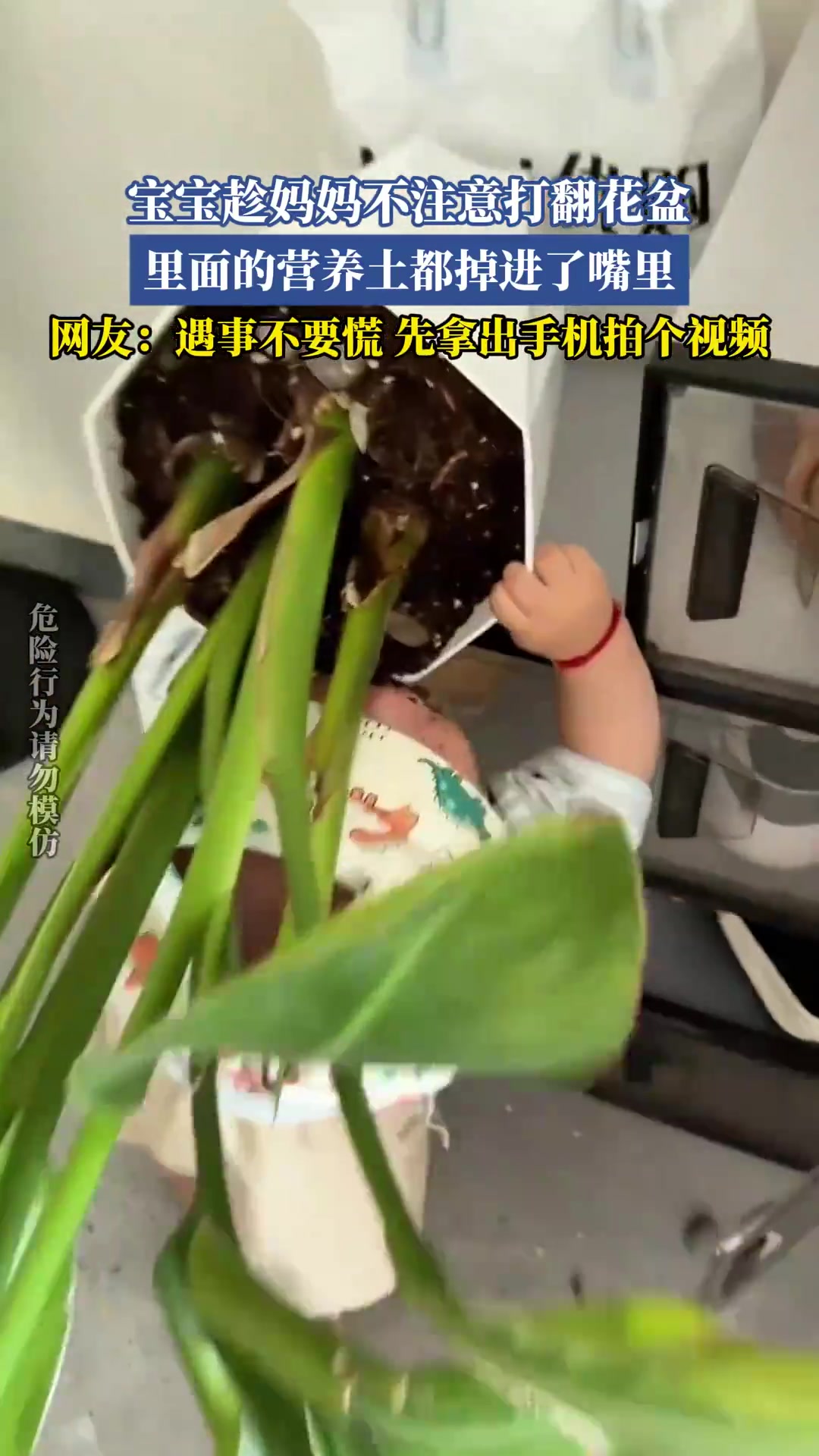 宝宝趁妈妈不注意打翻花盆