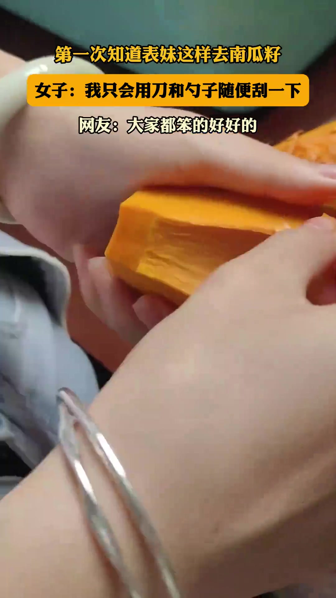 >第一次知道表妹这样去南瓜籽,女子:我只会用刀和勺子随便刮一下