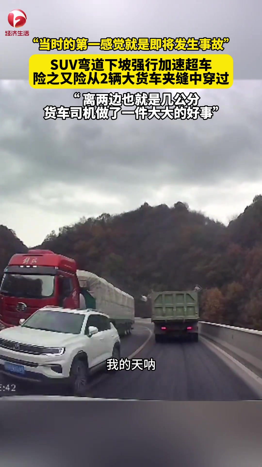 >真惊险!SUV弯道下坡强行加速超车,险之又险从2辆中穿过...