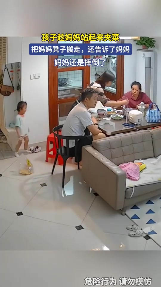 孩子趁妈妈站起来夹菜,把妈妈凳子搬走