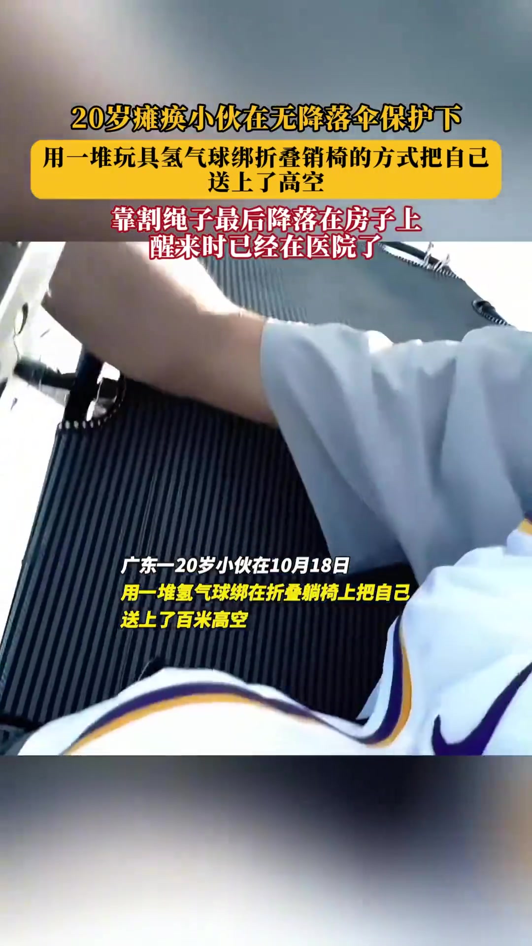 >小伙用一堆玩具氢气球绑折叠销椅的方式把自己送上了高空