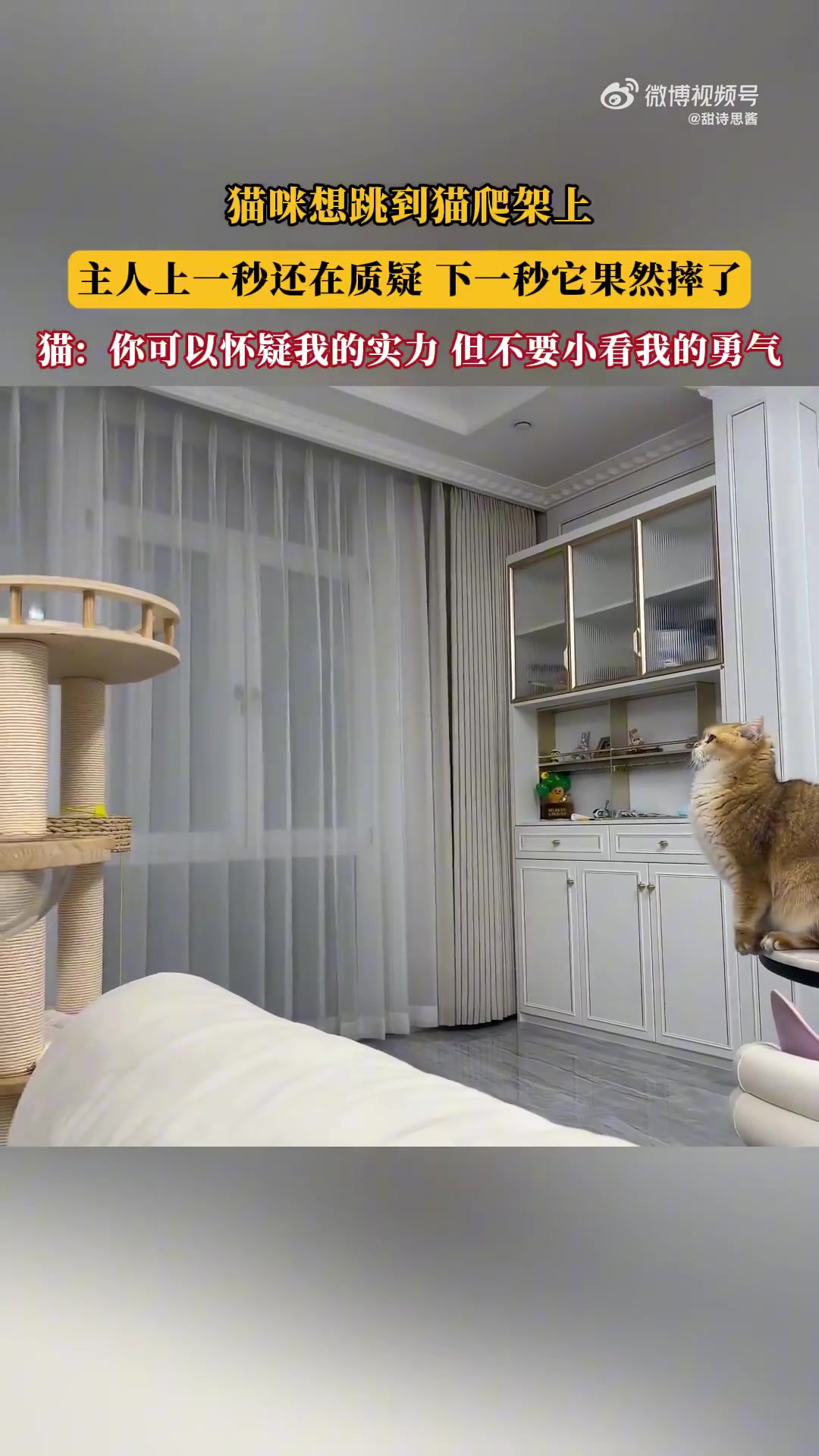 >猫咪想跳到猫爬架上,主人上一秒还在质疑,下一秒它果然摔了