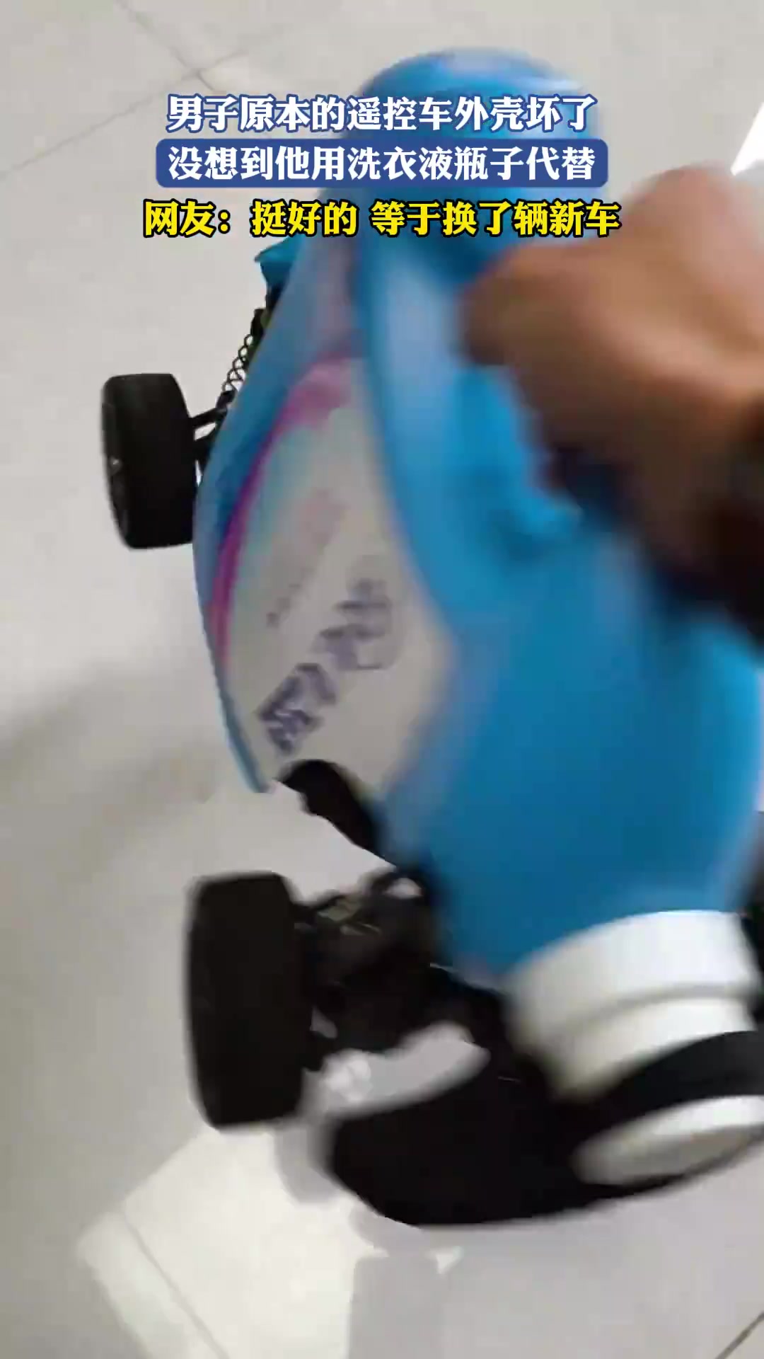 >男子原本的遥控车外壳坏了,没想到他用洗衣液瓶子代替