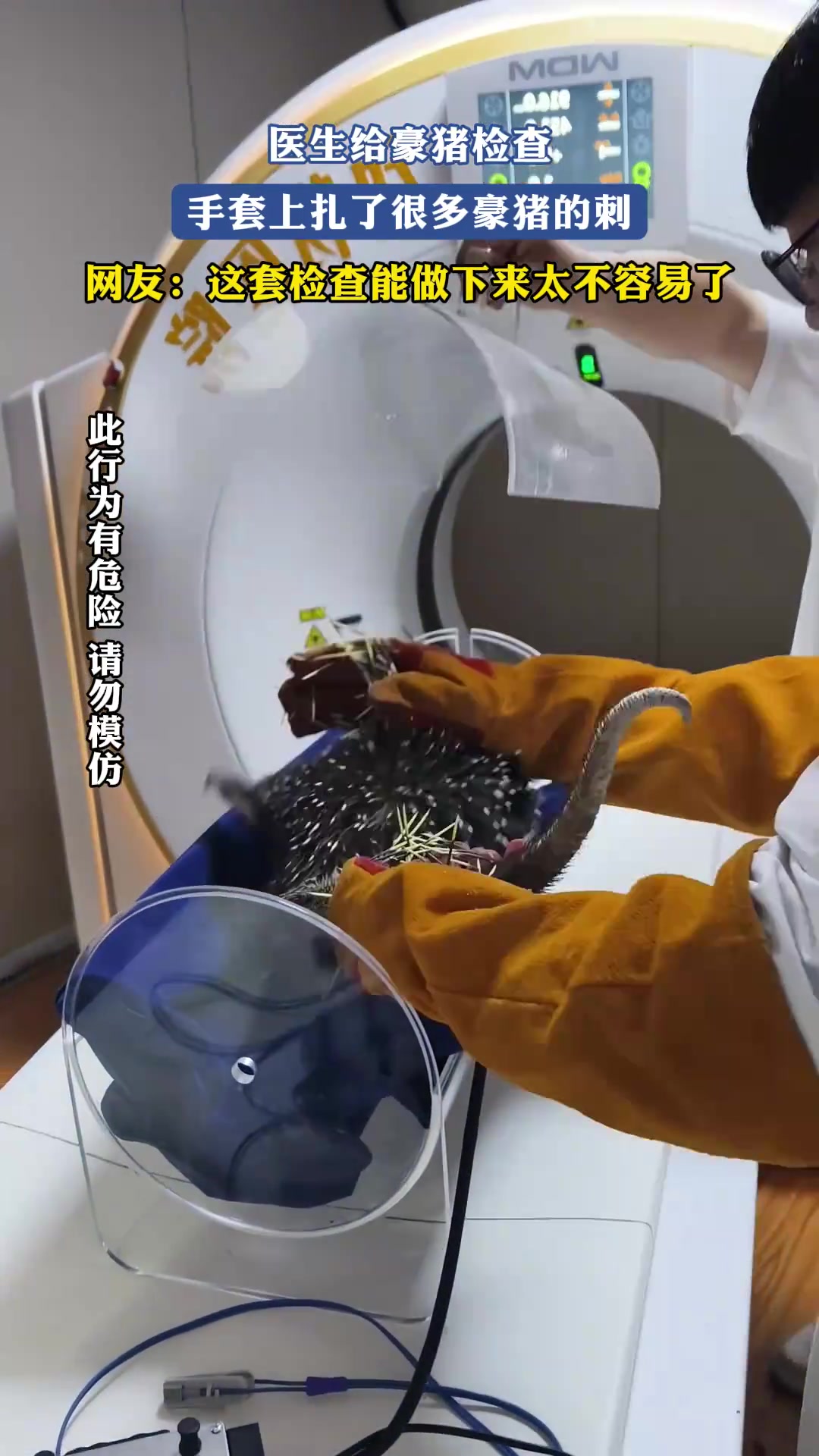 医生给豪猪检查,手套上扎了很多豪猪的刺