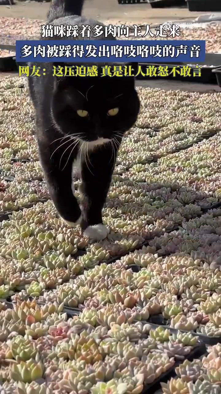 >猫咪踩着多肉向主人走来,多肉被踩得发出咯吱咯吱的声音