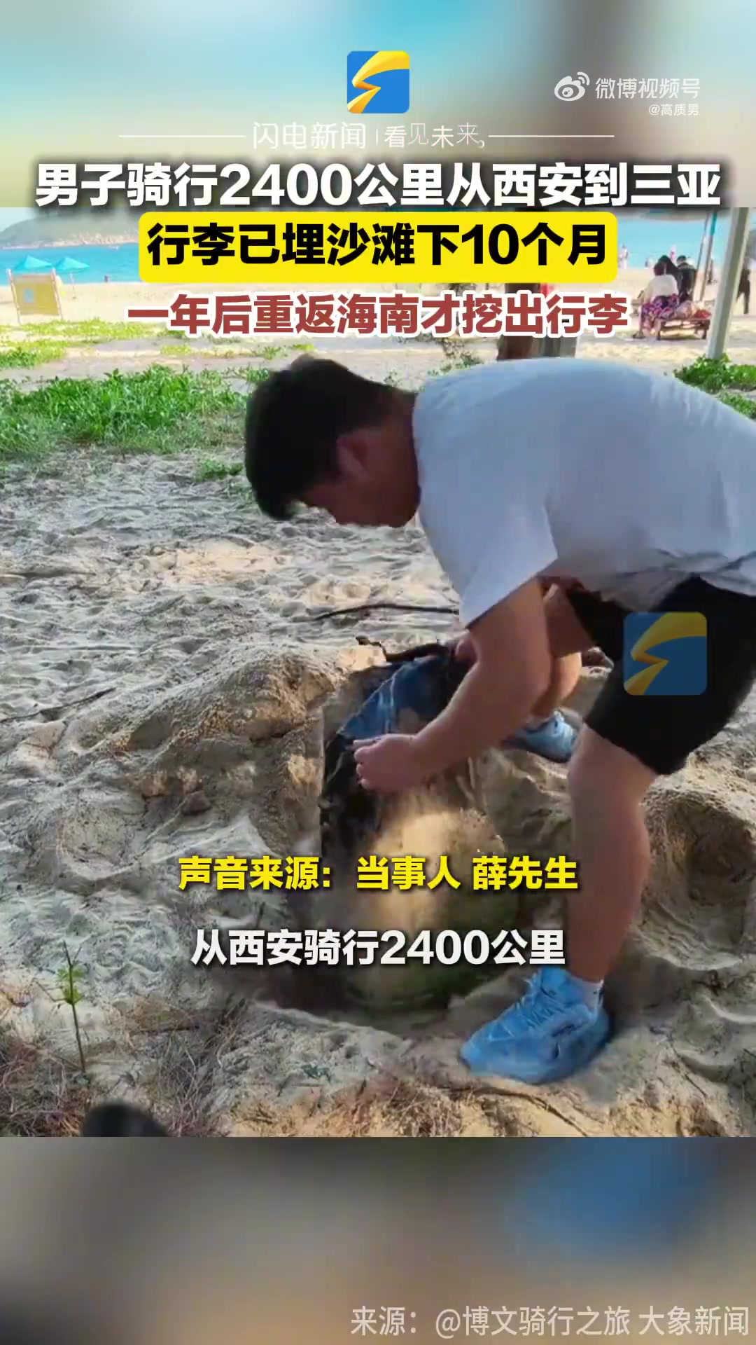>男子骑行从西安到三亚行李已埋沙滩下,一年后重返海南才挖出行李
