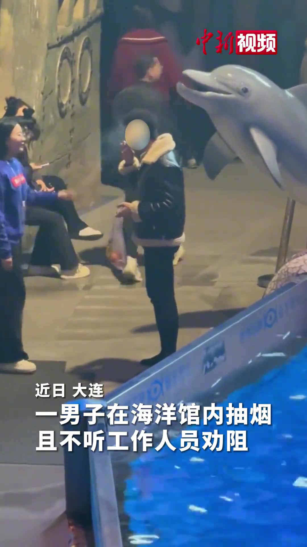 >男子海洋馆内抽烟且不听劝阻,白鲸直接从背后浇了个透。