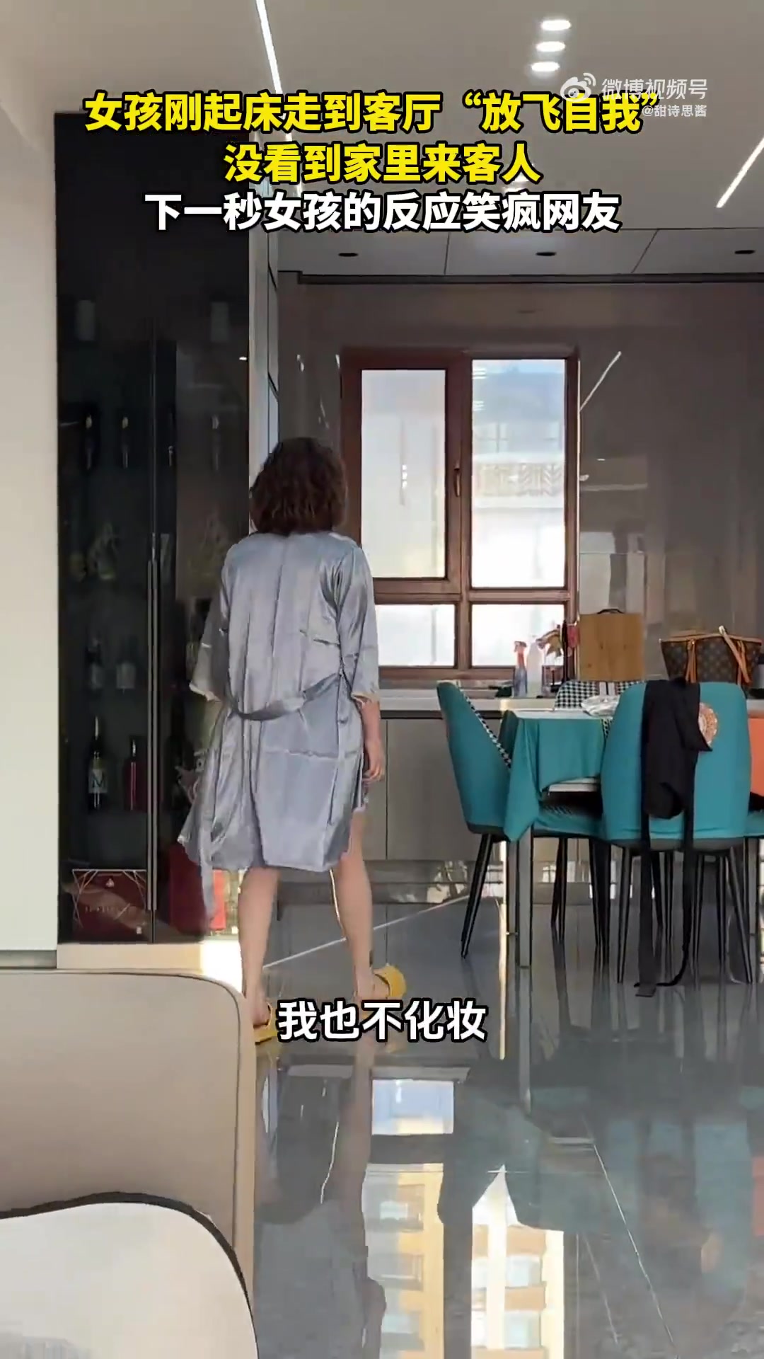 女孩刚起床走到客厅“放飞自我”,没看到家里来客人