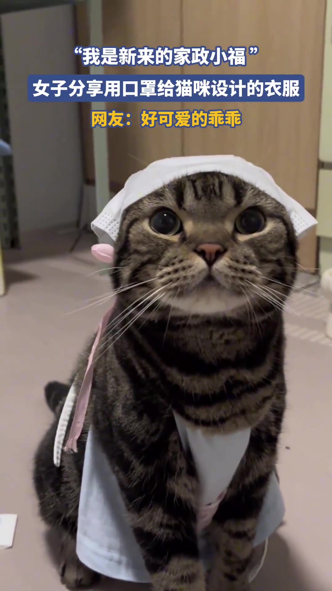 “我是新来的家政小福 ”,女子分享用口罩给猫咪设计的衣服