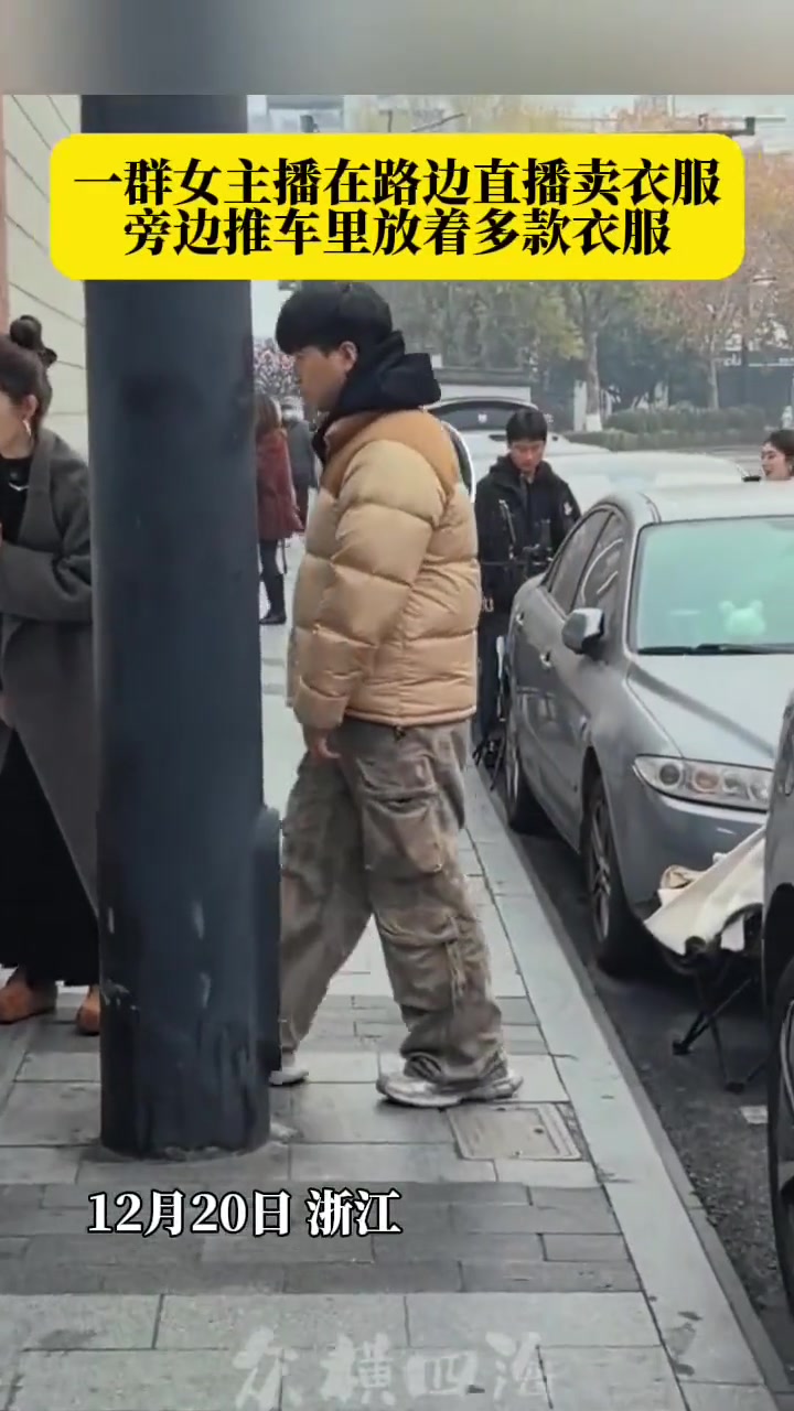 一群女主播在路边直播卖衣服,助理在旁边递上衣服试穿!