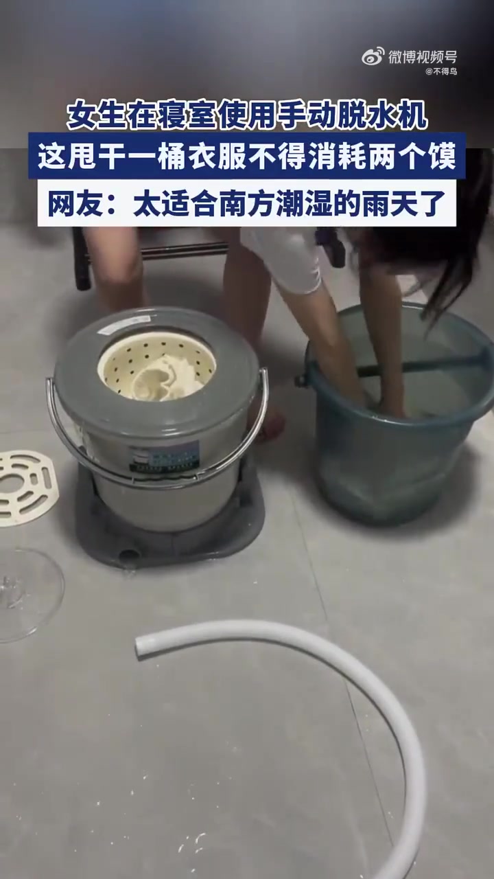 >女生在寝室使用手动脱水机,这甩干一桶衣服不得消耗两个馍!