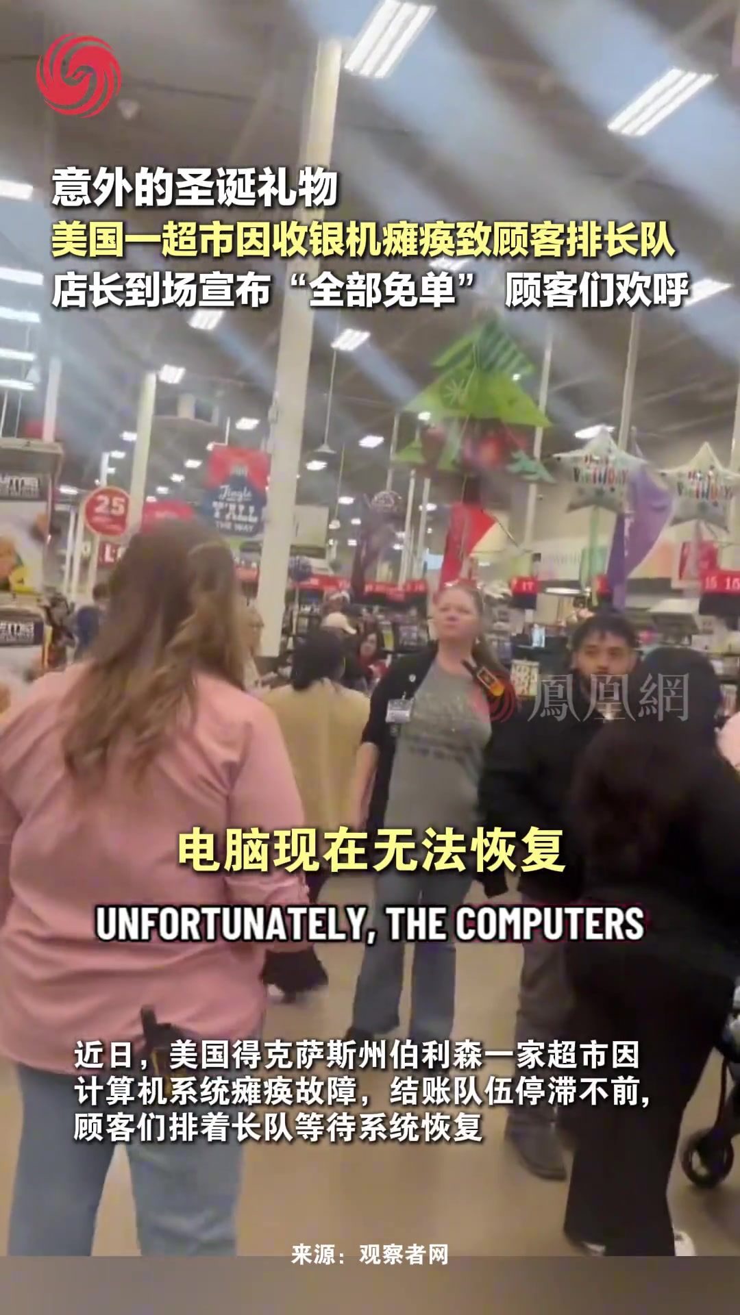 >美国一超市因收银瘫痪致顾客排长队,店长到场宣布“全部免单”