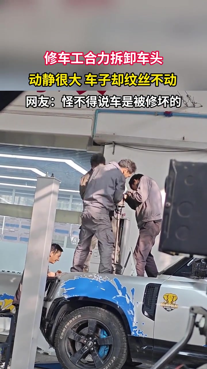 >修车工合力拆卸车头,动静很大 车子却纹丝不动!!